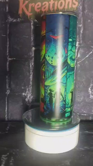 Stay hydrated in style this Halloween with our unique Horror Mash Up glow in the dark tumbler! Keep your hot drinks hot for up to 8 hours and cold drinks cold for up to 12 hours, while enjoying a spooky design. Perfect for sipping on the go and adding some extra flair to your Halloween festivities.